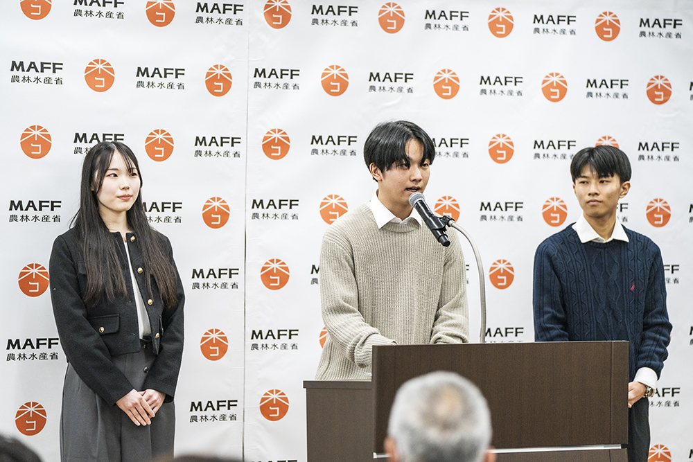 「ここちゅは長期的な消費には繋がらなかったと考え、今年は長期的な認知と消費につなげたいと考えています」とは、中村江都さん。また、臼井一馬さんは、「流行の拡散人で、社会問題、環境問題に関心のあるZ世代をターゲットにマーケティングをしていきたい。Z世代の食行動はSNSきっかけが多いとデータがあるので、SNSを介して、米粉の消費を促したいと考えています」と話しました。また、最後には来場者の皆さんへ「ぜひ一緒に活動を」と声をかけ、意気込みをアピールしました。