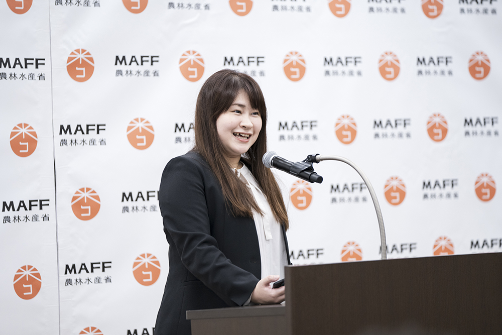 続いては、新潟大学経済学部でマーケティングを学ぶ石塚研究室の学生が登壇。新潟県農業総務課政策室から新潟大学社会連携推進機構を通じて石塚研究室に依頼された『食料自給率と米粉の普及についての広告戦略』(※)という受託研究に昨年から参加している3年生です。